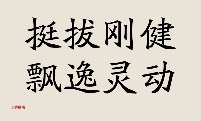 绝大多数字体并非是由单纯的直线或者单纯的曲线构成,横竖为直,撇捺为曲,有曲有直才显得刚柔并济,有力量,也有弹性。比如北魏楷书起笔处与转折处皆如削金断玉,干脆利落,整个字体也就显得挺拔刚健、英气勃勃,在撇与捺处又有优美的曲线,多一分圆润,也就多一分飘逸灵动。