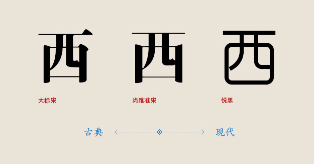 这里所说的简与繁并不是简体与繁体,而是笔画细节的复杂程度。具个最简单的例子,衬线体相对来说要比非衬线体细节复杂一些,宋体也比黑体复杂一些。正如花纹繁复华丽是古典家具的典型特征,简洁实用的宜家家居是现代生活的典范一样,字体的繁复与简单一定程度上也代表着古典与现代走向。