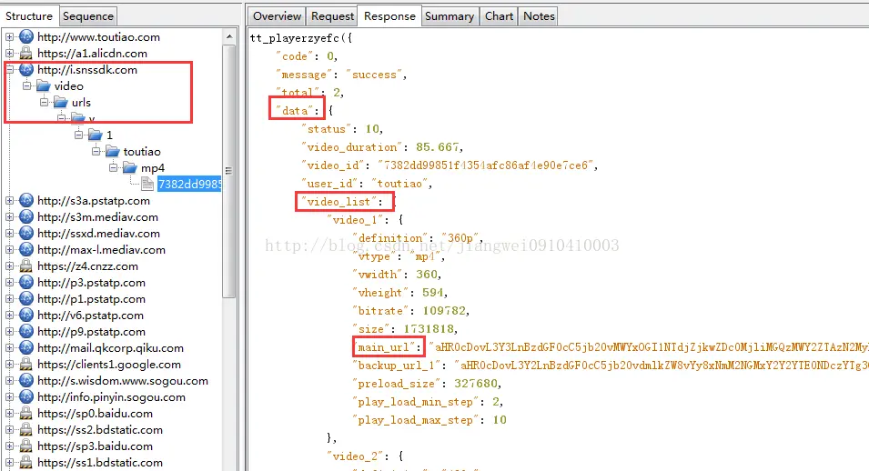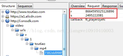 看到请求的链接了,携带的r和s参数值,这里抓包主要看:http://i.snssdk.com/video/urls/v/1/toutiao/mp4/,这个就是上面的remoteURL值,在js中可以查到的。然后在查看返回值: