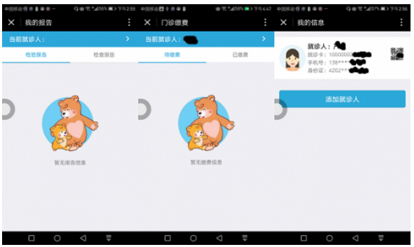 看完病之后,可以在小程序里查阅检查报告和缴费,免去在医院窗口排队等候的痛苦,另外最右的图显示可以同时添加多个就诊人,方便全家人使用。