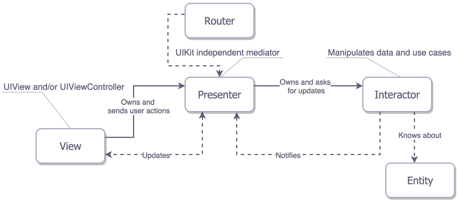 同样没有实践过……但直观上感觉是把 MVP 进行了进一步拆分——Presenter 拆为 Presenter 和 Router,Model 拆为 Interactor 和 Entity。