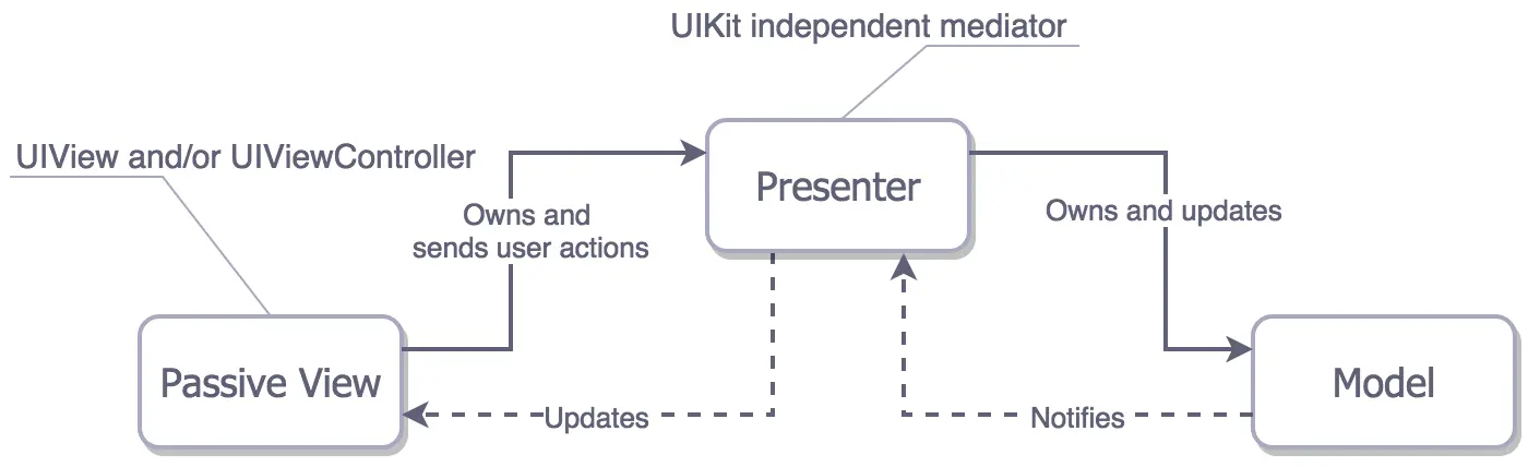 同 MVC 一样,而今的 MVP 与最早的 MVP 也相距甚远。现在为人所普遍接受的 MVP 是,V 和 M 完全解耦,通过 C 进行通讯。但和 Apple MVC 不同的是,P 并不包含生命周期控制之类的职责,而且一般是由 V 去持有 P。