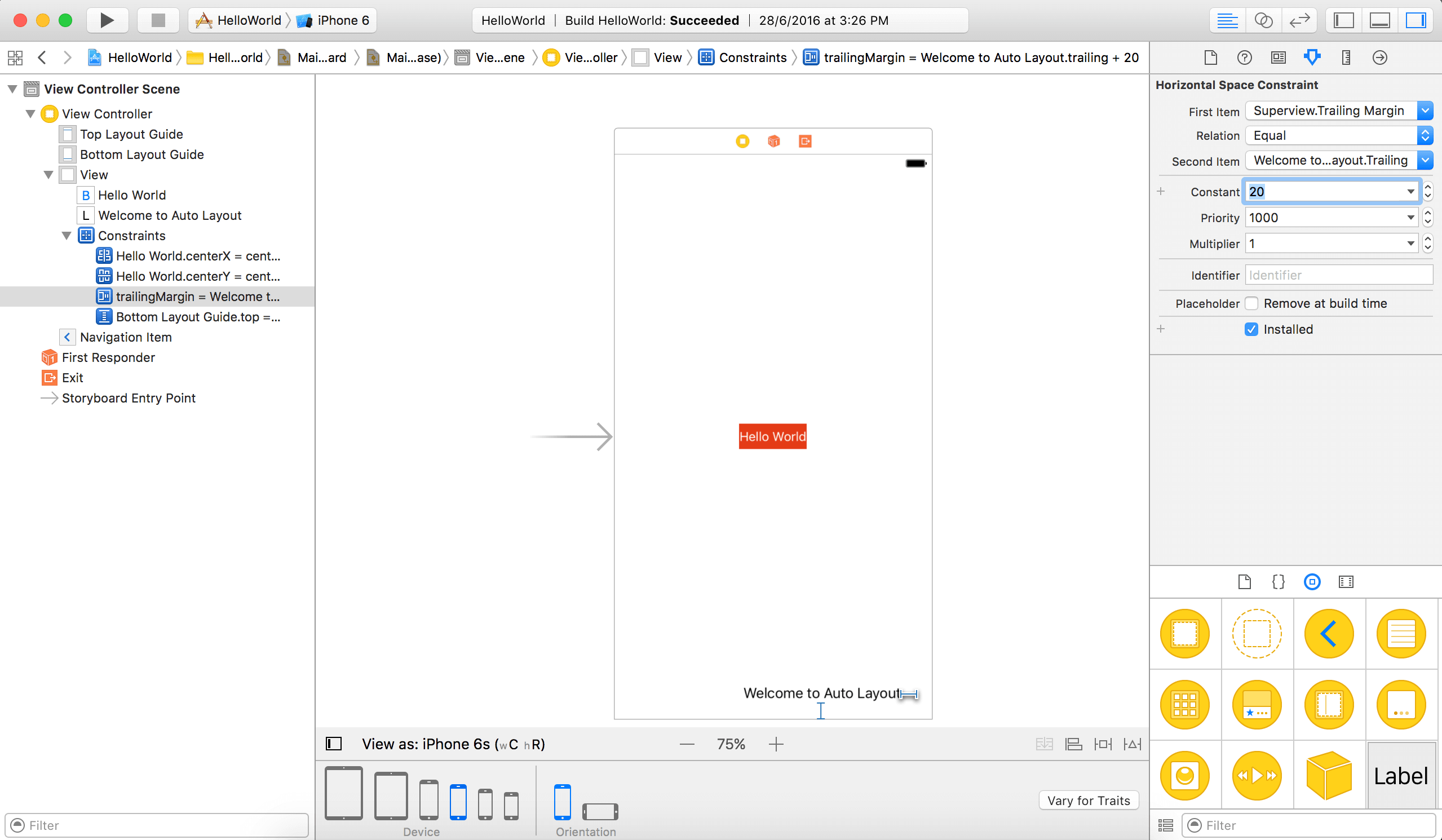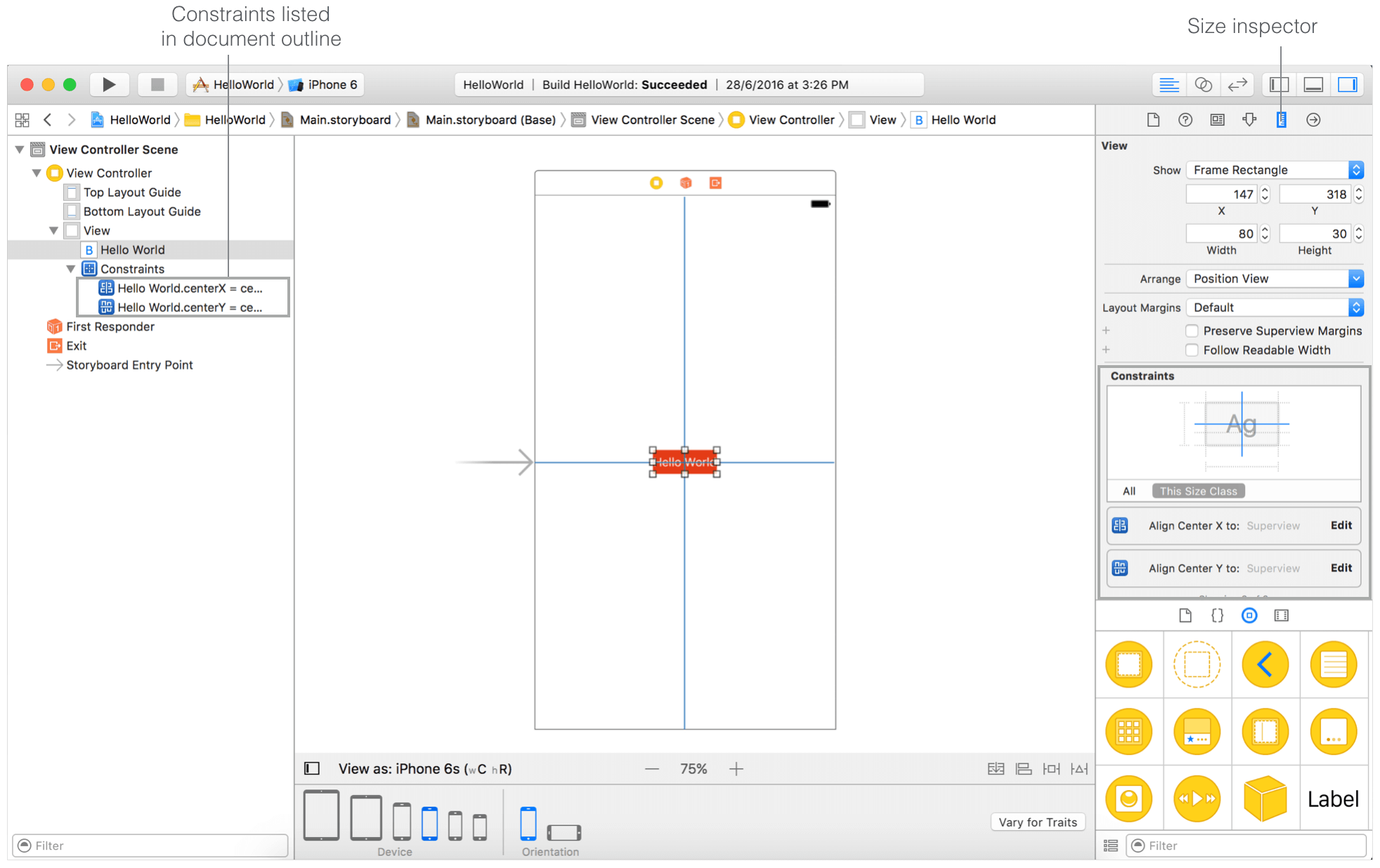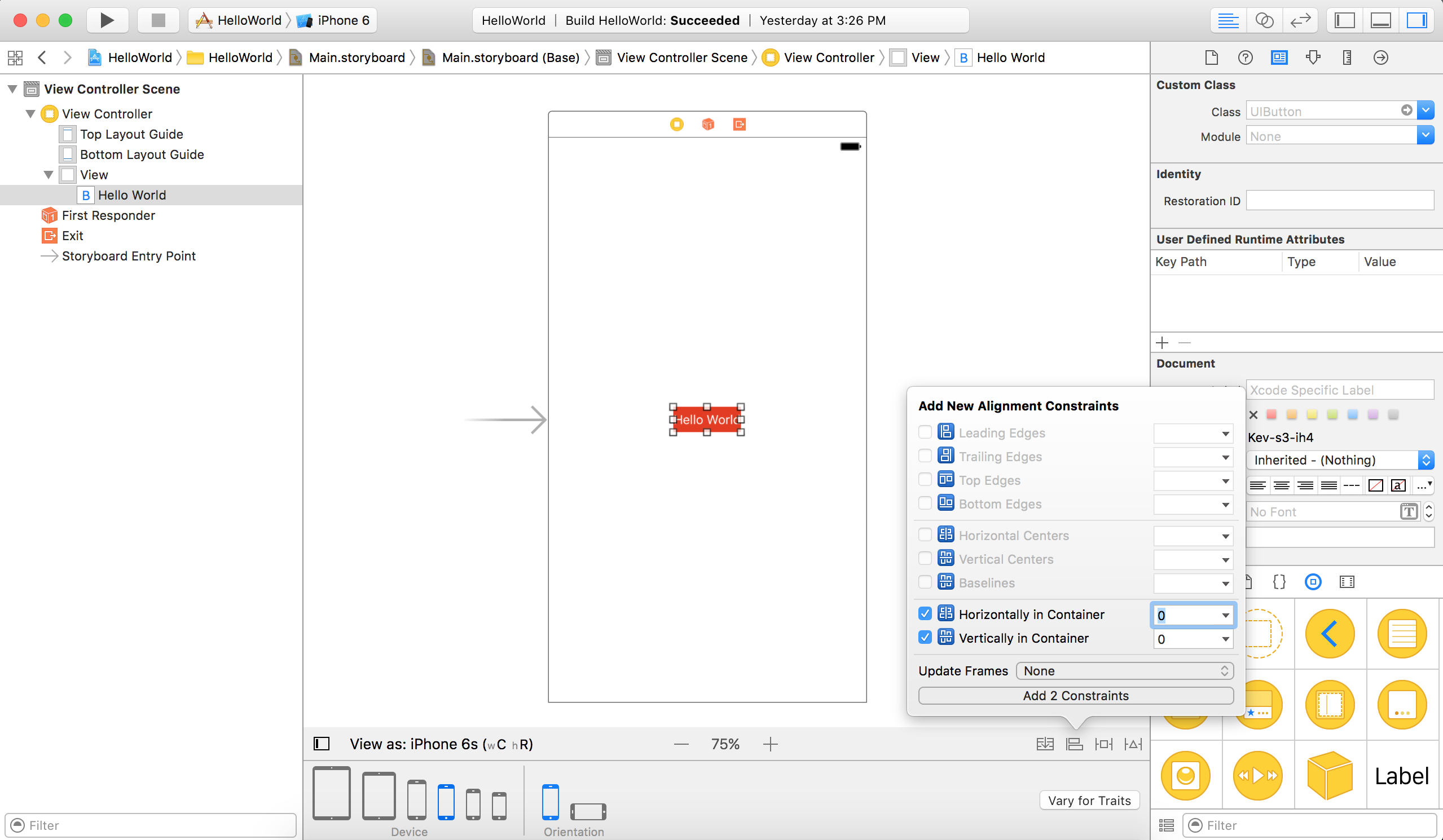 好了,auto layout的基本知识差不多够了,现在来看看在Interface Builder中如何定义处于中心位置“Hello World”按钮的约束。