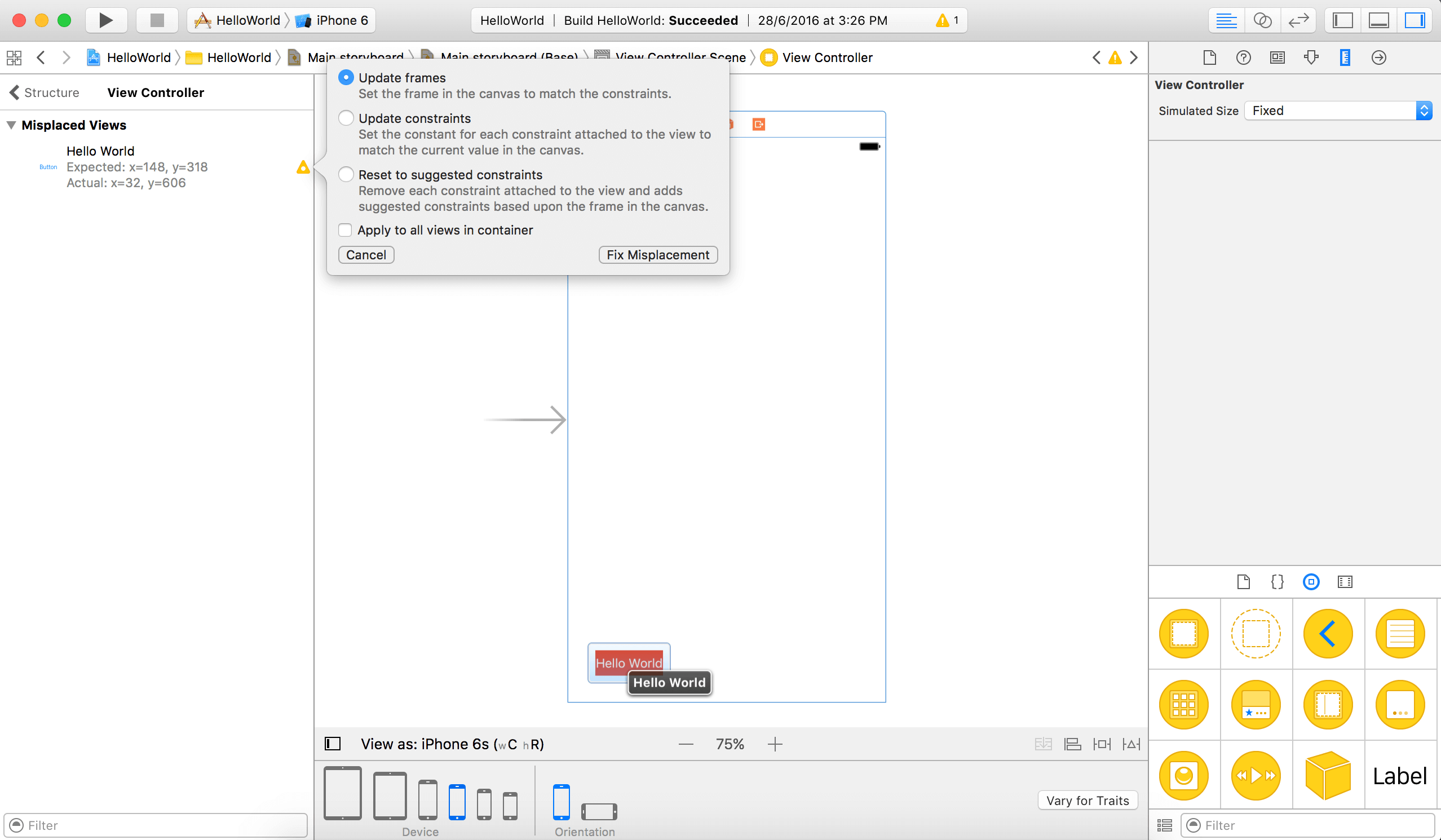 当存在布局问题时,文档大纲视图中会显示一个未闭合的箭头(红/橙),点击箭头可以看到一个问题列表。Interface Builder会帮我们解决这些问题,点击问题旁的指示图标会出现一些解决方法,选择“Update Frame”并点击“Fix Misplacement”,按钮就被移动到视图中心了。