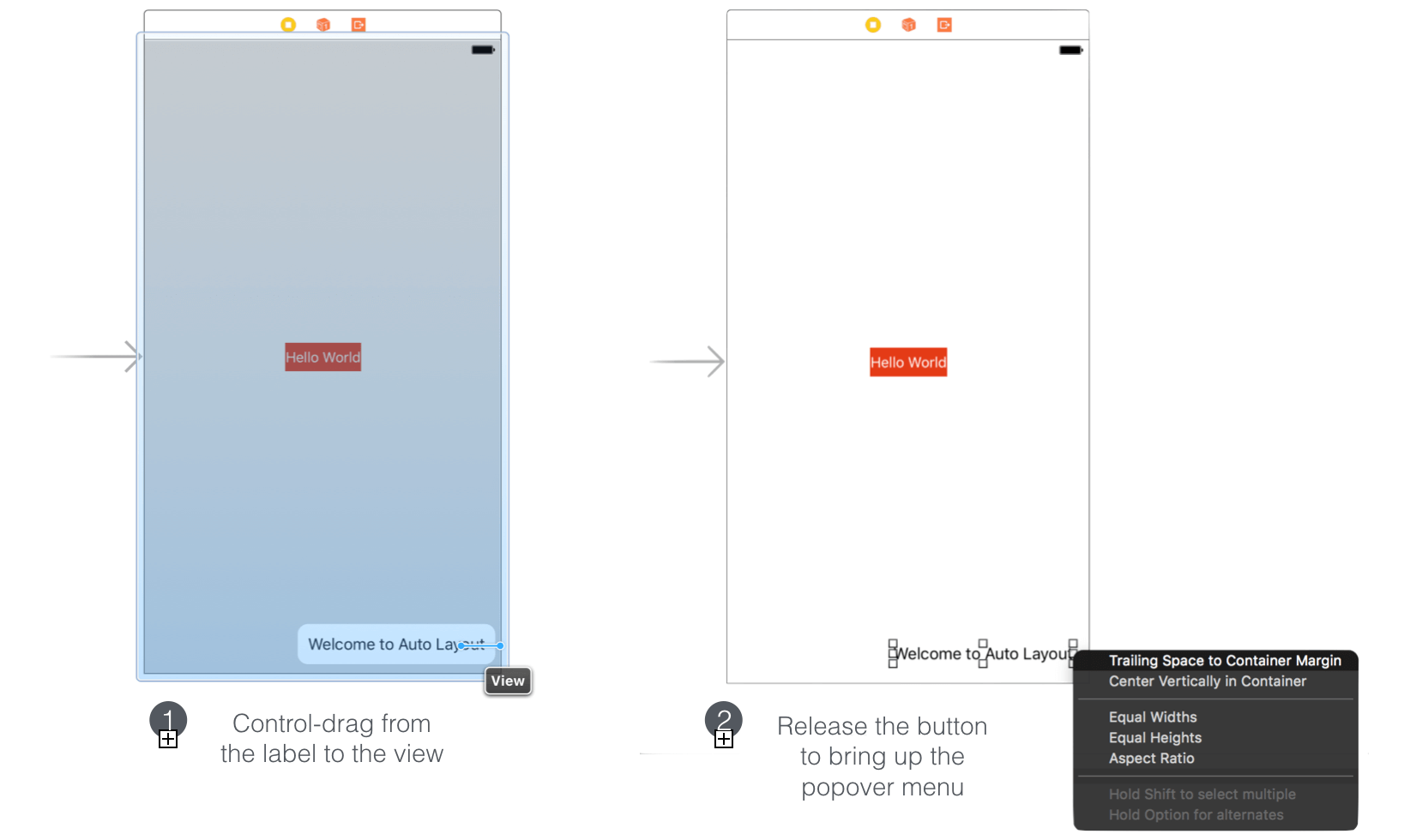 来添加第一个空间约束,按住control键把标签拖拽到右侧直到视图变成蓝色高亮的状态,松开按钮后会出现一个包含约束列表的菜单。选择“Trailing space to container margin”添加一个按钮与视图右边界的空间约束。