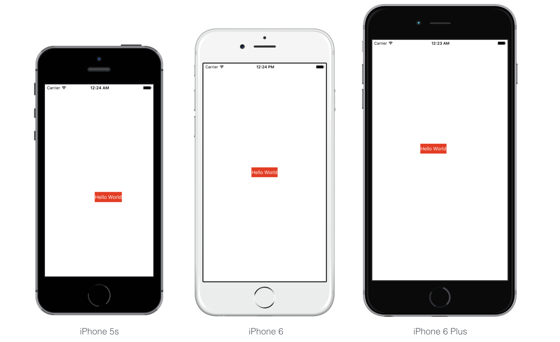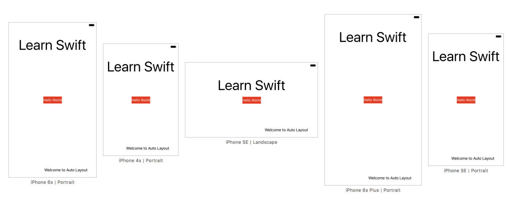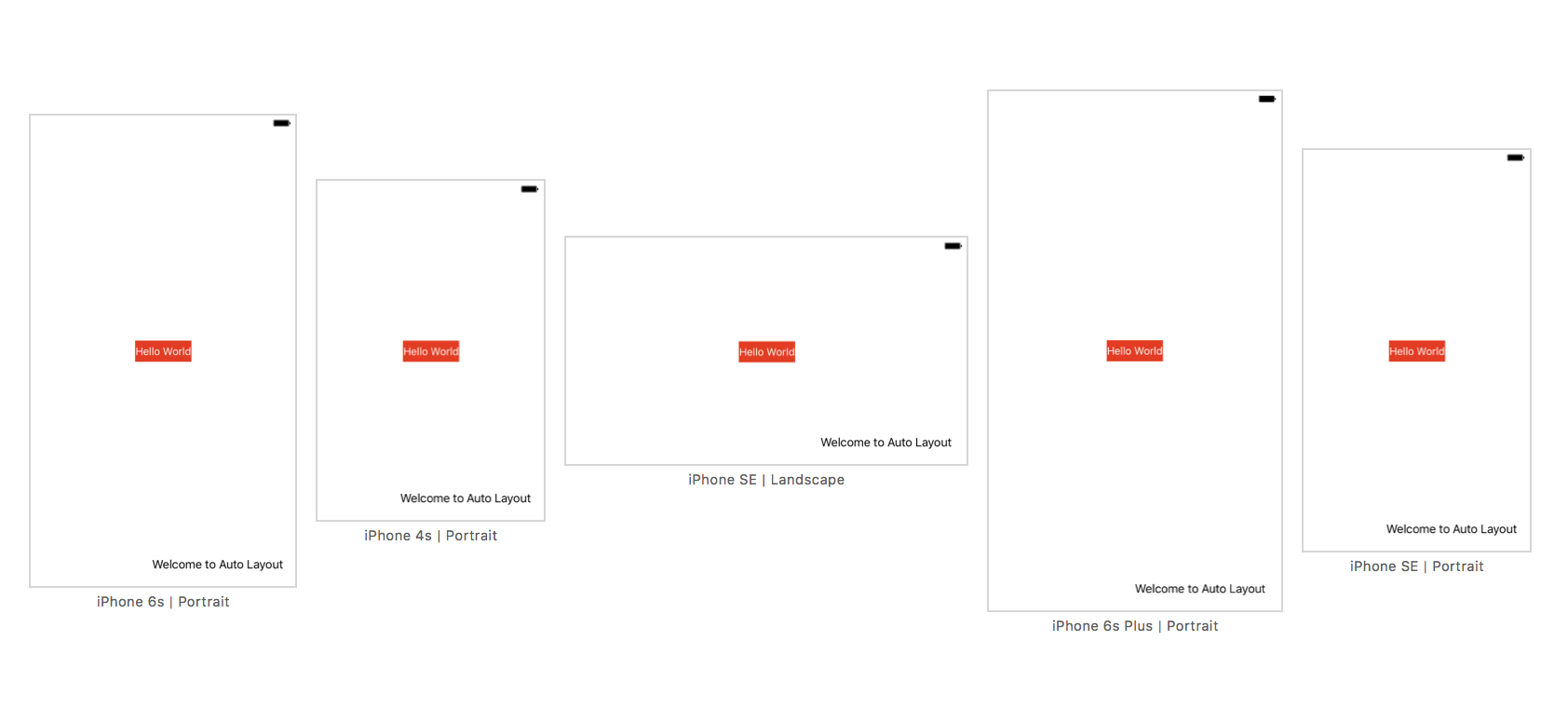 没有auto layout的话,我们在故事版中放置的按钮就是固定位置的。换句话说,“硬编码”了按钮的起始点。在我们的例子中,把“Hello World”按钮的起始点设为了(147, 318)。因此,不管你使用的是3.5英寸、4英寸,还是5.5英寸的模拟器,iOS都会把按钮画在指定的位置。下图中画出了在不同设备中的按钮,解释了为何“Hello World”按钮仅仅在iPhone 6/6s上是中间位置,其它设备上都偏离了中心,水平朝向上也同样偏离了。