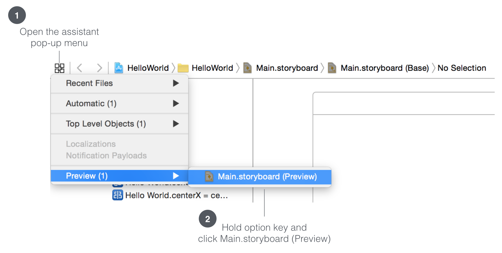 在Interface Builder中打开辅助用弹出菜单 > Preview (1),按住option键的同时点击Main.storyboard (Preview),如下图: