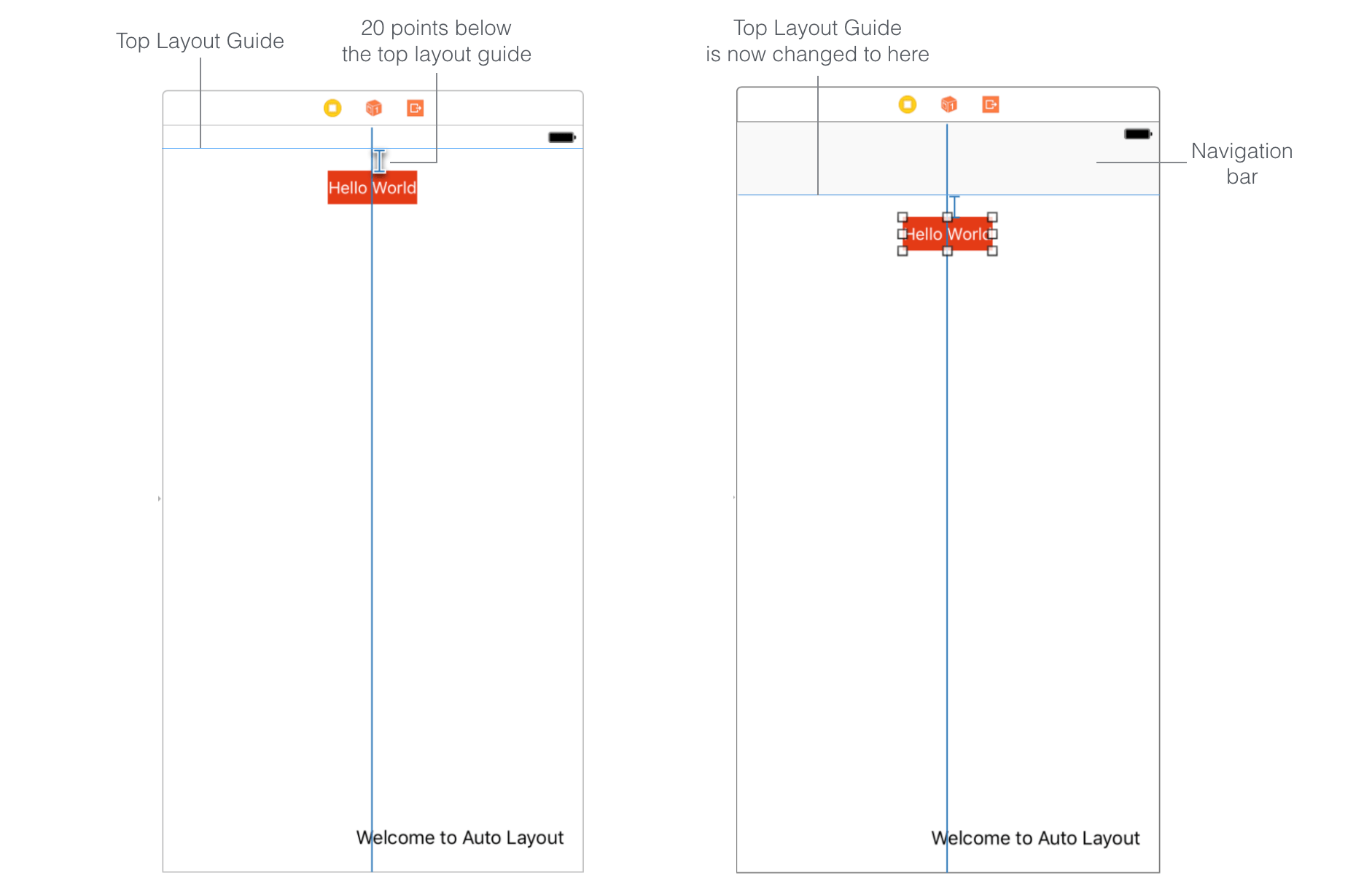 这些布局辅助约束对于定义布局约束来说是非常有用的,因为他们会根据视图的布局变化自动调整。比如说,如果视图中有一个导航栏,那么top layout guide就会移动到导航栏的下方(如下图)。因此,只要UI组件的约束是与top/bottom layout guide相关联的,那么在添加一个导航栏或工具栏时界面就会自动调整成正确的布局。T