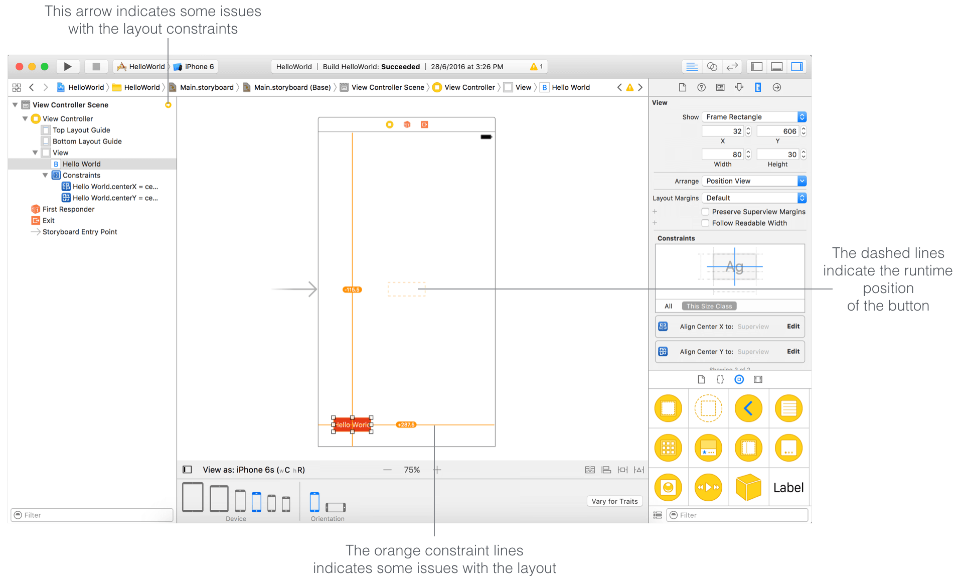 试着把Hello World按钮拖到屏幕的左下方部分,Xcode会立即检测到布局问题,通过橙色的约束线条指出错位的部件。