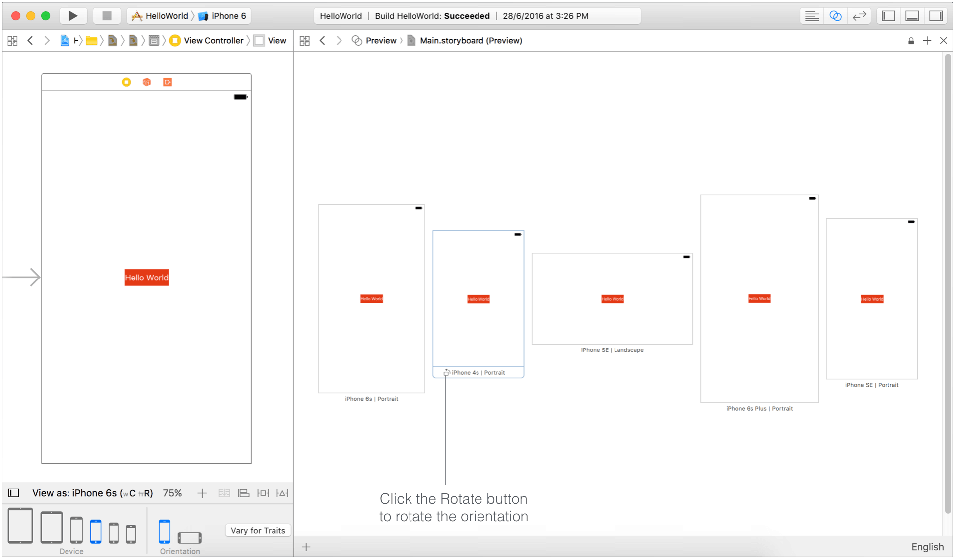 点击Stop按钮,使用iPhone 6/6s模拟器运行,模拟器启动后,在菜单中选择 Hardware > Rotate Left (or Rotate Right),这会使设备旋转到水平模式。也可以按下command+左箭头/右箭头来旋转设备方向。这一次,Hello World按钮也没有在中间。