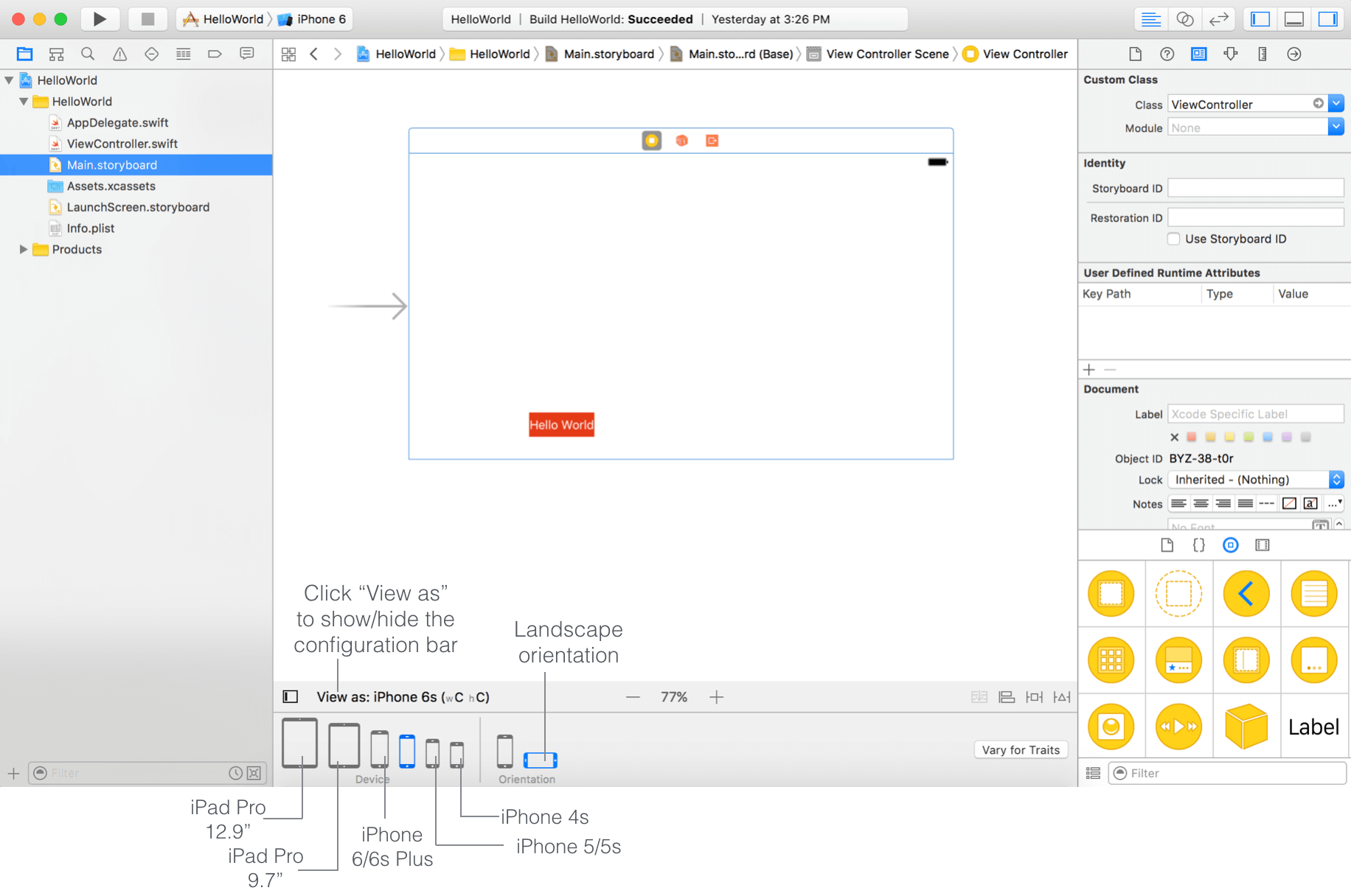 首先,打开HelloWorld工程中的Main.storyboard(或者从这儿下载:www.appcoda.com/resources/s…). 在UI界面上添加布局约束之前,先简要介绍一下Xcode 8中的一个方便的特性。