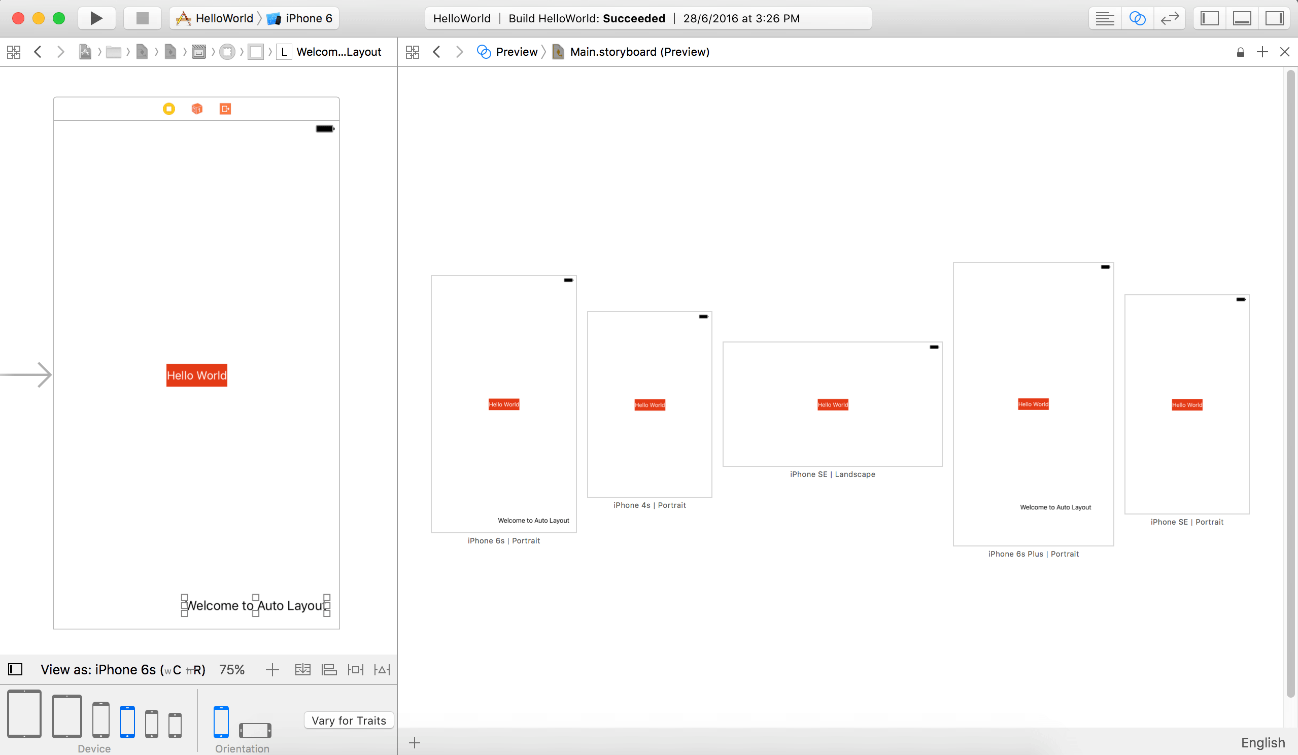 默认情况下Interface Builder被设为预览iPhone 6s的界面,为了观察在其他设备上的效果,点击View as: iPhone 6s按钮展开配置栏,然后选择你想要测试的iPhone/iPad设备,也可以改变设备的朝向。下图展示了一个Hello World app在iPhone 6s横屏时的实时预览。