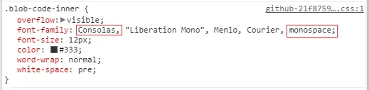 上图是 Github 代码区块的字体设置,可以看到,默认字体就是 Consolas ,紧接着的几个都是其它等宽字体,如果用户的系统中都没有预装这些字体,则会匹配最后一个 monospace ,它表示等宽字体系列,会从用户系统中的等宽字体中选取一个展示。