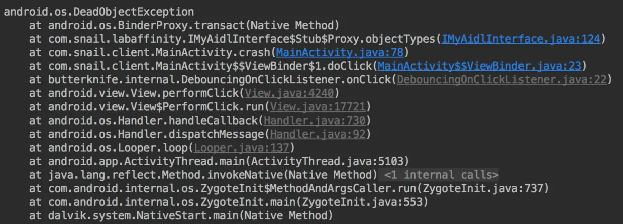 }由于没有主动调用finish的,所以AMS并不会清理掉ActivityRecord与TaskRecord ,因此resume的时候走的就是上面的分支,可以这里会调用next.app.thread.scheduleSendResult或者next.app.thread.scheduleResumeActivity进行唤起上一个Activity,但是如果APP或者Activity被异常杀死,那么唤起的操作一定是失败,会抛出异常,首先假设APP整个被杀死,那么APP端同AMS通信的Binder线程也不复存在,这个时候通过Binder进行通信就会抛出RemoteException,如此,就会走下面的catch部分,通过startSpecificActivityLocked再次将APP重建,并且将最后的Activity重建,其实你可以本地利用AIDL写一个C/S通信,在将一端关闭,然后用另一端访问,就会抛出RemoteException异常,如下图: