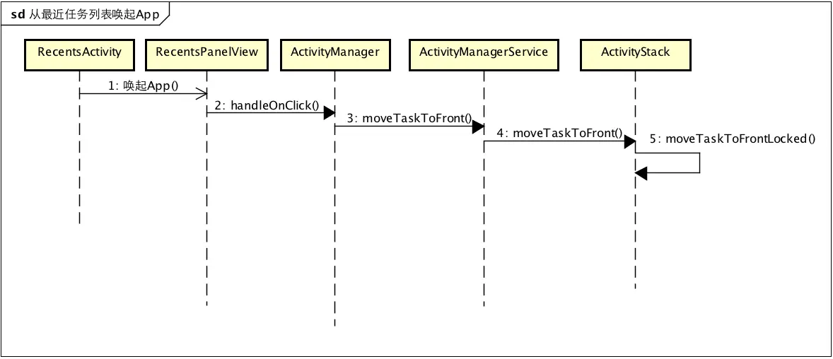 }可以看出RecentTaskInfo的id是由TaskRecord决定的,如果TaskRecord中numActivities > 0就去TaskRecord的Id,否则就取-1,这里的numActivities其实就是TaskRecode中记录的ActivityRecord的数目,更具体的细节可以自行查看ActivityManagerService及ActivityStack,那么这里就容易解释了,只要是存活的APP、或者被LowmemoryKiller杀死的APP,其AMS的ActivityRecord是完整保存的,这就是恢复的依据。RecentActivity获取的数据其实就是AMS中的翻版,RecentActivity并不知道将要唤起的APP是否是存活的,只要TaskRecord告诉RecentActivity是存货的,那么久直接走唤起流程,也就是通过ActivityManager的moveTaskToFront唤起App,至于后续的工作,就完全交给AMS来处理。现看一下到这里的流程图: