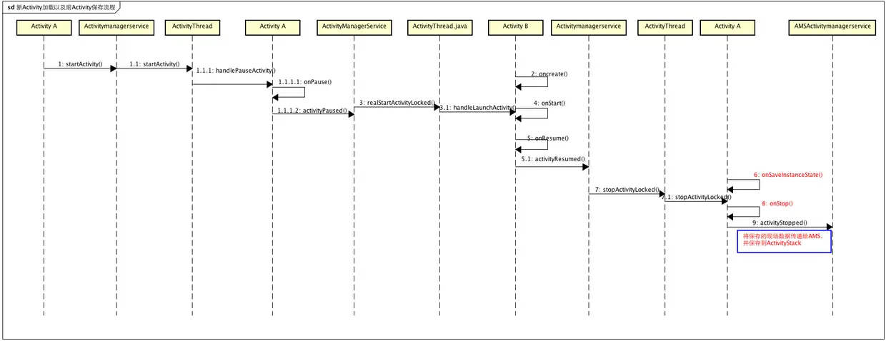}通过上面流程,AMS不仅启动了新的Activity,同时也将上一个Activity的现场进行了保存,及时由于种种原因上一个Actiivity被杀死,在回退,或者重新唤醒的过程中AMS也能知道如何唤起Activiyt,并恢复。