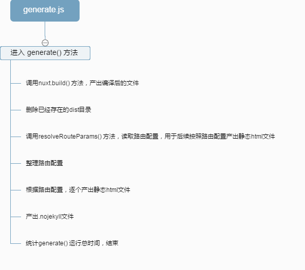 在执行nuxt generate时,它会先执行前文已经分析过的build()方法,产出编译后的文件;然后会初始化dist目录,调用resolveRouteParams()方法,读取产出后的路由配置并整理。然后通过fs.writeFile()等API,把内容挨个写入文件并输出,最后再统计总的generate()运行时间。