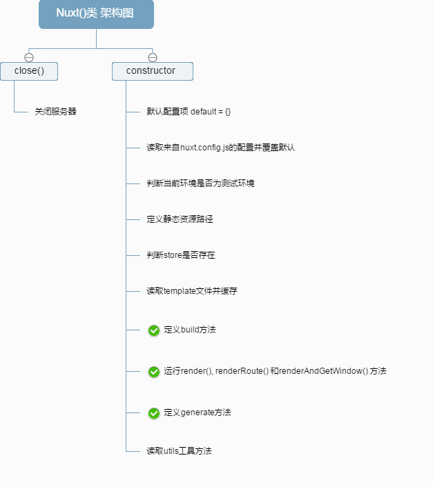 上图中每一步都可以在具体的代码中自行浏览。在用户输入指令并实例化了Nuxt()类以后,实例化出来的nuxt对象就会执行图中打了绿色对勾的几个方法:build(), render(), renderRoute(), renderAndGetWindow()以及generate()方法。