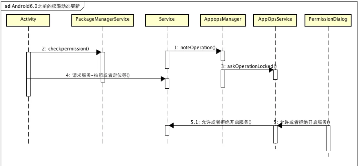 关键节点并不是查询是否具有该权限,Android6.0之前的 权限查询是不会触发权限申请与授权的,只有在请求系统服务的时候,由系统服务调用AppopsManager去查询是否赋予了该权限,第一次未操作肯定是null,未赋予就可能会触发权限申请逻辑,这个点在各个系统服务内部,由AppOpsService服务统一管理,不过对于官方的Release版本,其实只有系统通知APP才有动态权限管理的能力,其他都没有操作能力。