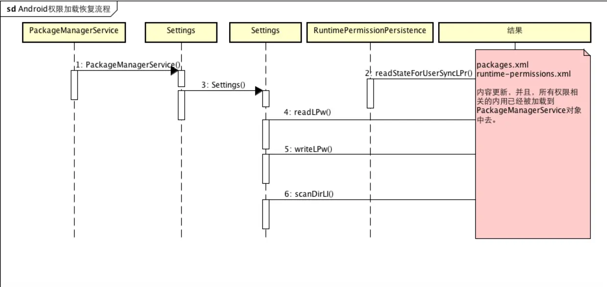 <!--加载package信息-->根据SettingsFile或者BackupSettingsFile读取相应的设置信息 生成PackageSetting对象,里面有权限列表字段protected final PermissionsState mPermissionsState;,之后再运行中,动态权限的操作都是针对这个对象