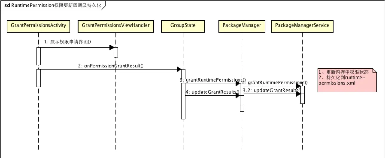 }下一步,要将更新的权限持久化到文件中去 mSettings.writeRuntimePermissionsForUserLPr