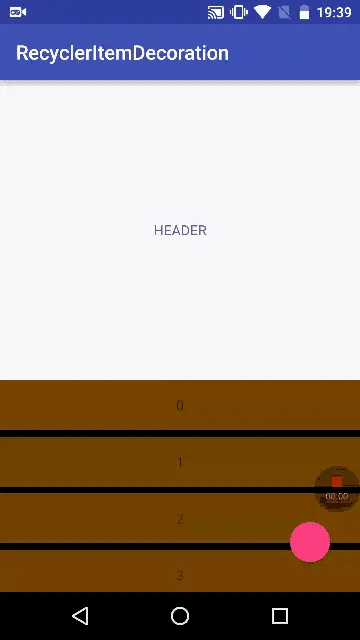mRecyclerView.setLayoutManager(linearLayoutManager);以上就是最简单的线性RecyclerView的实现,但默认不带分割线,如果想要使用比如20dp的黑色作为分割线,就需要自己定制,Google为RecyclerView提供了ItemDecoration,它的作用就是为Item添加一些附属信息,比如:分割线,浮层等。