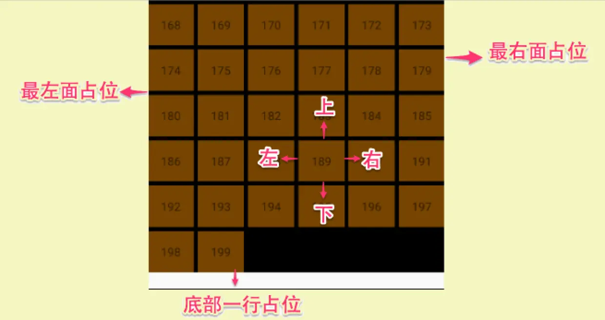网格式RecyclerView的处理流程跟上面的线性列表类似,不过网格式的需要根据每个Item的位置为其设置好边距,比如最左面的不需要左边占位,最右面的不需要右面的占位,最后一行不需要底部的占位,如下图所示