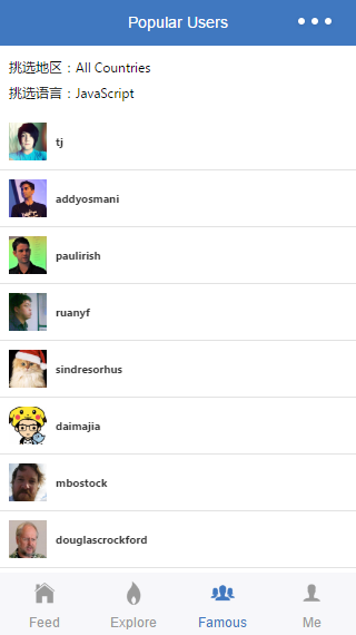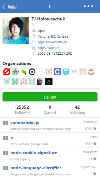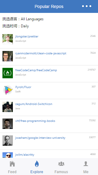 Github Feed 微信小程序 uniquexiaobai 2017-01-14 1,727 阅读1分钟 原文链接: github.com GitHub Feed 小程序版 参考:react-native-gitfeed 已完成的功能 一些痛点 不支持 WebView ,故不能使用 OAuth2 获得 GitHub 授权,目前会有每小时 60 次的 API 请求限制 ; wx.request() 这个网络请求的 API 封装的太简单粗暴,以至于不能获取响应头中的其他域,如 Link ; 不支持 ES2015 原生的 Promise,故不得不引入第三方的 Promise 库,此处使用的是 bluebird ;