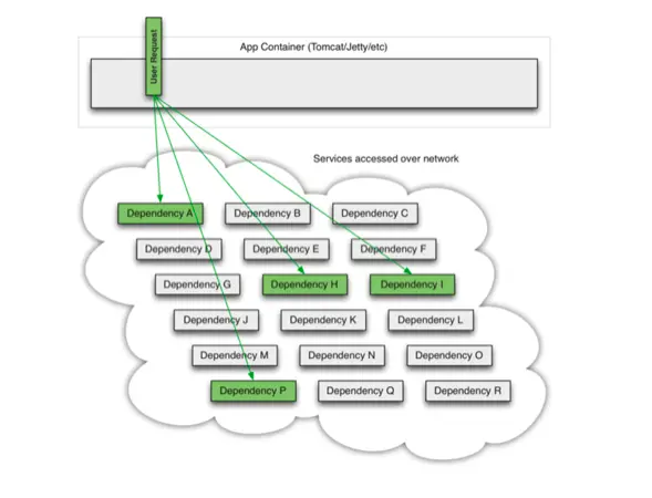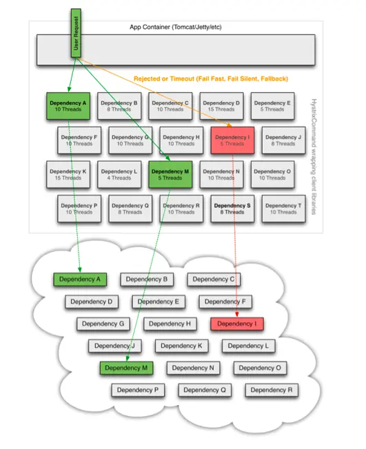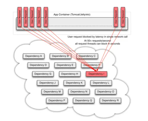 上述三幅图,描述了系统从初始的健康状态到高并发场景下阻塞在下游的某个关键依赖组件的场景。这种情况很容易诱发雪崩效应。而通过引入Hystrix的熔断机制,让应用快速失败,继而能够避免最坏情况的发生。