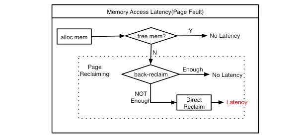 Linux会用尽可能多的内存来做缓存,大多数情形下,服务器可用内存都较少。可用内存较少时,应用程序申请或者访问新的内存页会引发内存回收,当后台内存回收的速度不及分配内存的速度时,会进入直接回收(Direct Reclaim),应用程序会自旋等待内存回收完毕,产生巨大的延迟,如下图所示。