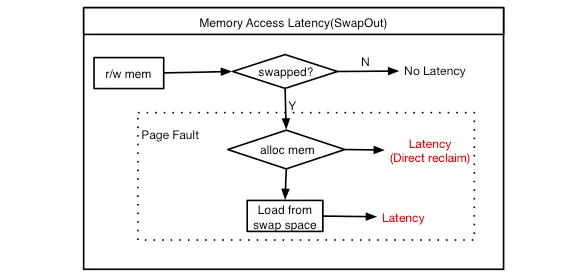 另一方面,内核也会回收匿名内存页,匿名内存页被换出后下一次访问会产生文件IO,导致延迟,如下图所示。