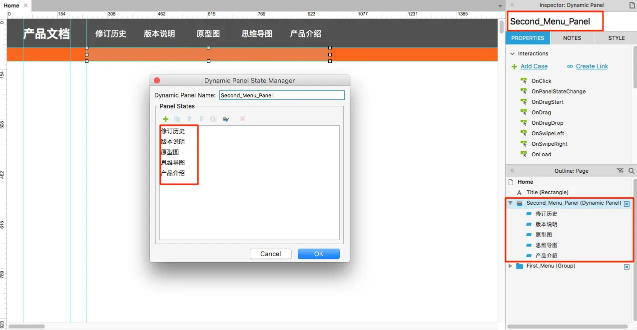 由于一个一级菜单项中存在一个对应的二级菜单,所以需要加入一个动态面板进行对应二级菜单的展示。如图所示,动态面板的每个状态都与一级菜单项一一对应。