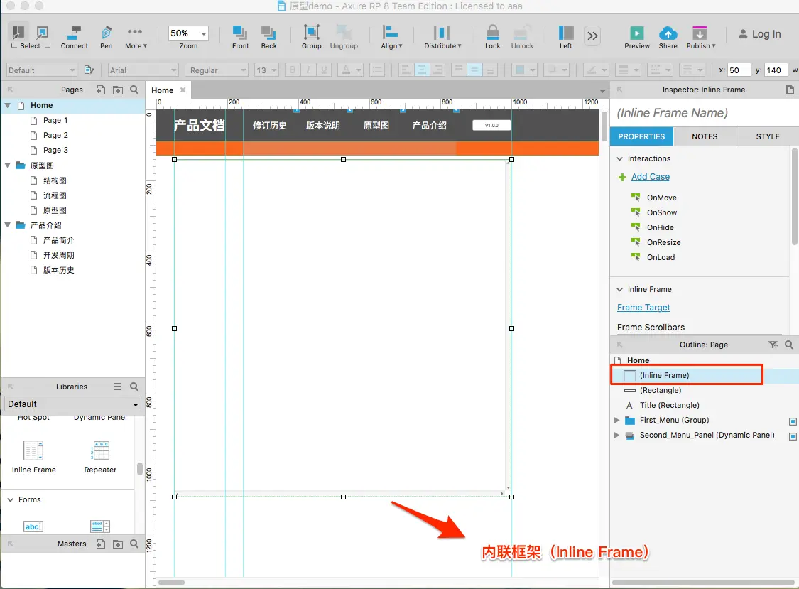 然后把二级菜单项或一级菜单项(没有二级菜单)和内联框架进行绑定,即设置他们的单击事件。如把原型图中的结构图菜单通过内联框架绑定到Pages模板中的结构图页面。操作如下图: