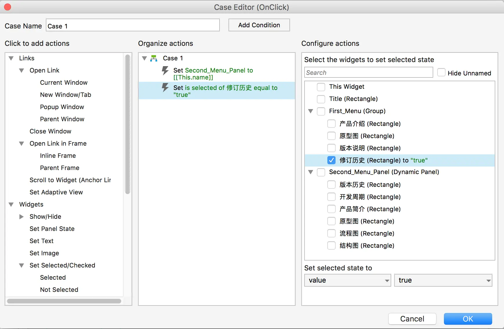 假设一级菜单项中的文本为产品介绍,然后把该文本作为变量,然后去打开对应面板中与该变量值对应的状态页。