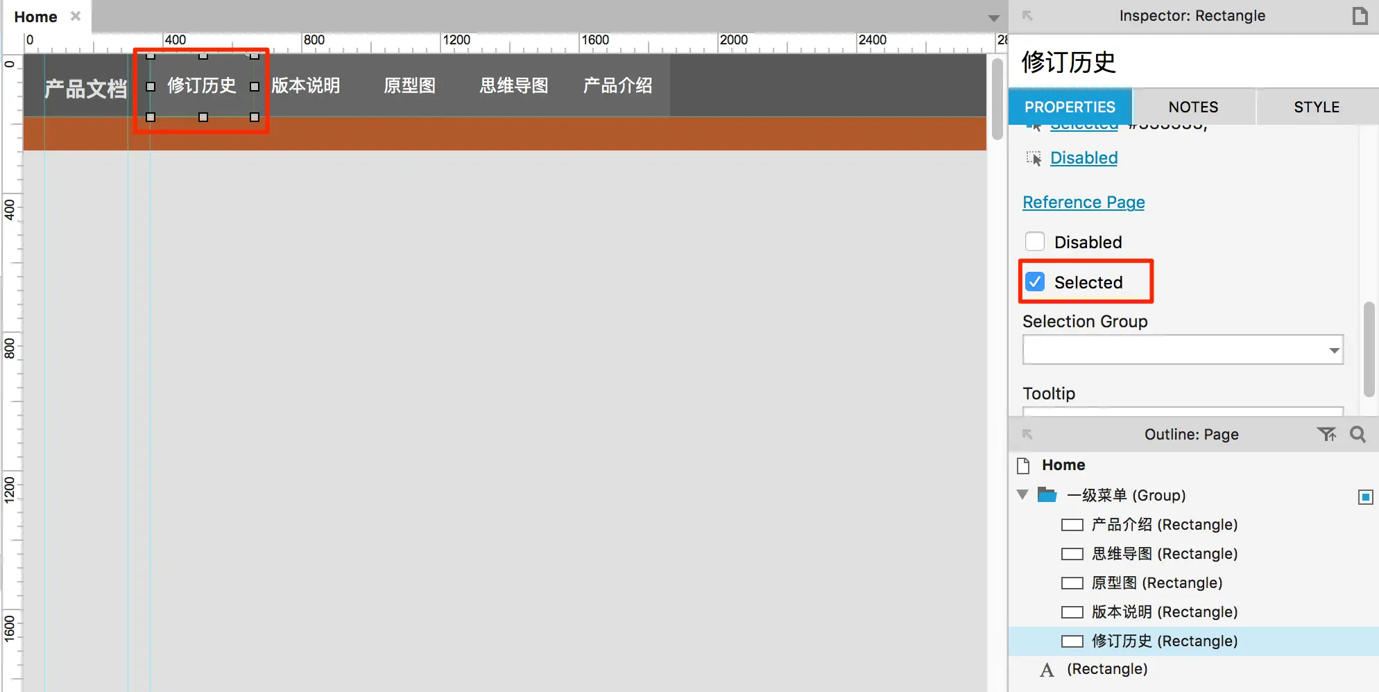 以上设置完之后就可以在预览时实现鼠标滑过时的动态效果。这里需要优化的一点是在“修改历史”,即菜单的第一项,选中它,然后属性页面选中selected,即用户一进出此页面时,该菜单选项默认是被选中的。如下图:
