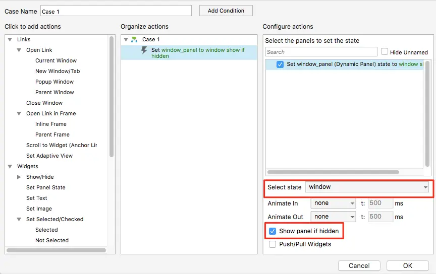 - 接着把window_pandel动态面板右击设置为隐藏,然后给弹出窗口按钮设置onclick事件。