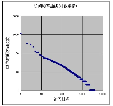 第二幅图是对数轴的访问频率曲线,源数据和上图一致,可以看到近似为一条直线: