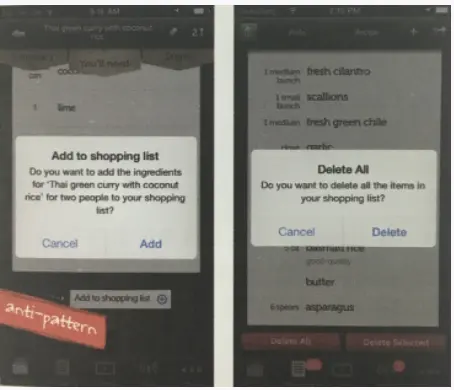 点击添加到购物清单时弹出对话框要求用户确认。 右图是删除确认,在执行一个不可撤销的操作前要求用户确认是正确、合理的设计。否则就是打扰用户。