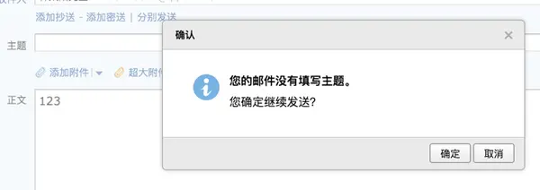 在用户操作前即给出正确且有效地引导和提示,有助于减少错误发生的可能性。如 QQ邮箱网站为了防止用户错误,在用户点击发送后提示没有输入主题信息,从而避免用户直接发送无主题邮件。