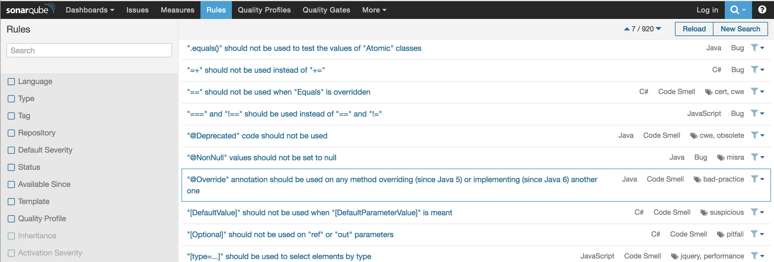 - Quality Profile:挑选特定语言下各种规则组成的配置;其中可以启用或禁用一部分规则。
