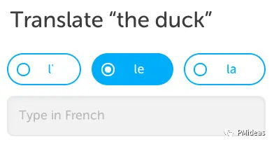 好的水平排布的单选按钮组案例可以在Duolingo app中看到:它们使用一组经典的横向按钮,在视觉上凸显出目标区域并且对于触摸设备来说足够大。