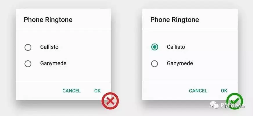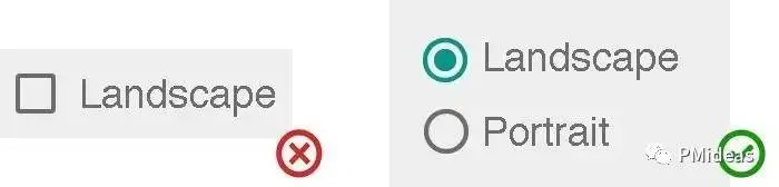 替代选项。如果复选框无法完全清晰的表明意义,则使用单选按钮。在例子中,选项是对立的因此使用单选按钮是更好的方案。