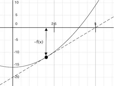 这条直线的斜率是函数值改变量与函数参数改变量的比值。所以,按照f(x)除以这个斜率来平移x,就会得到切线到达 0 时的x值。