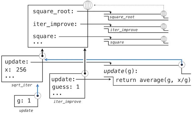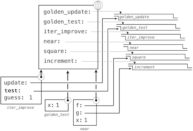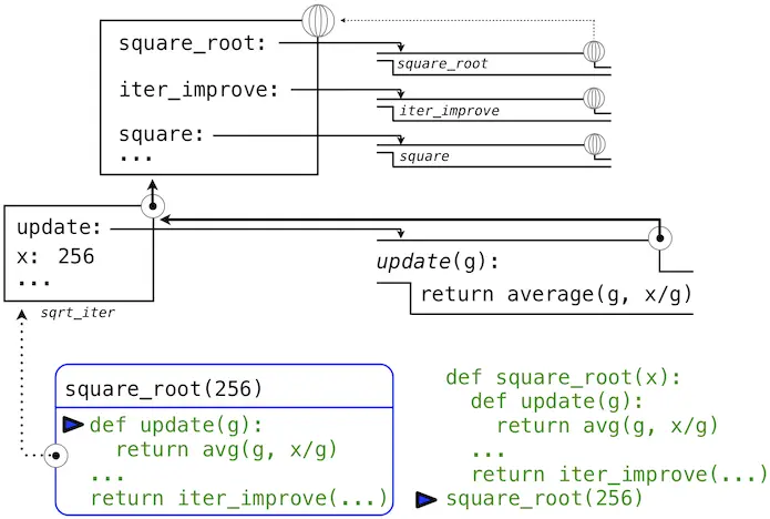随后,update的名称解析到这个新定义的函数上,它是向iter_improve传入的参数。在iter_improve的函数体中,我们必须以初始值 1 调用update函数。最后的这个调用以一开始只含有g的局部帧创建了update的环境,但是之前的square_root帧上仍旧含有x的绑定。