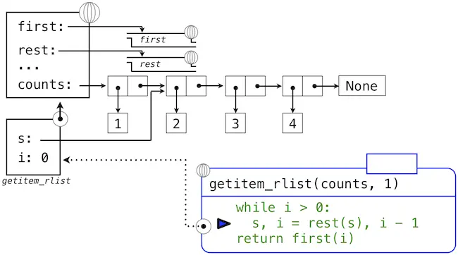 最后的环境图示展示了调用first的局部帧,它包含绑定到相同子列表的s。first函数挑选出值2并返回了它,完成了getitem_rlist的调用。