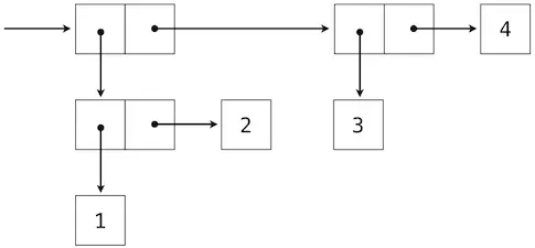 我们可以使用嵌套偶对来构建任意长度的元素列表,它让我们能够实现抽象序列。下面的图展示了四元素列表1, 2, 3, 4的递归表示: