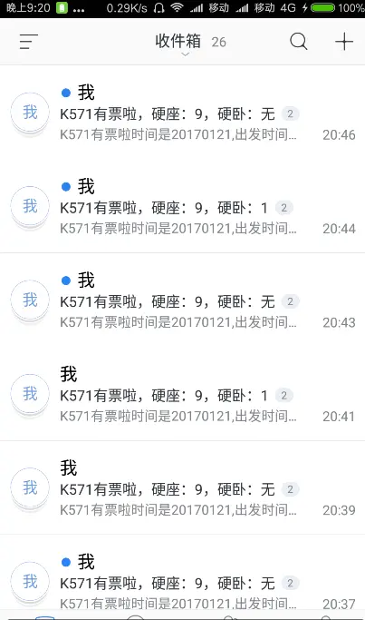 这个思路的有两点前提,第一、要自己提前确定好想买哪一辆火车,包括:火车车次,日期。第二、自己要经常在电脑前,只要一来邮件就去12306买票,这对于程序猿来说已经满足了。