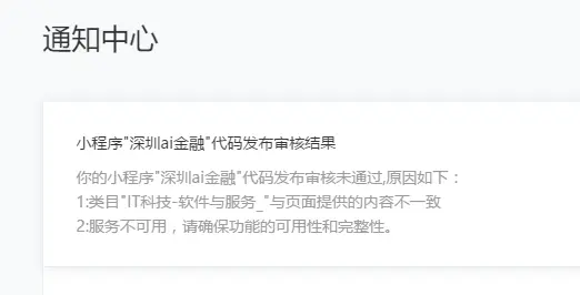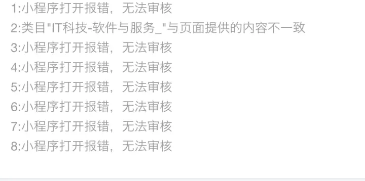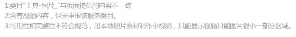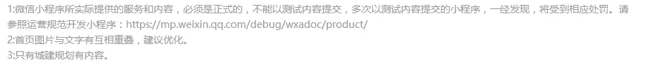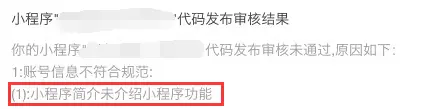 除本微信小程序平台常见拒绝情形外,开发者还应遵守 《微信小程序平台服务条款》及腾讯公布的相关规则、规范。 1.帐号基本信息1.1小程序名称、简介、logo、服务范围、服务标签、帐号基本信息文字均不得: (1)侵犯他人权益(著作权、商标权、肖像权、名誉权等)。包括但不限于,使用或包含不属于该小程序主体的品牌或商标、标识等内容或与之相似的内容、信息、特殊角标。示例:检查名称、简介中是否含有该小程序不属于该帐号的权益。 (2)含有商业化用语的、热门小程序名称、“国家级”、“最高级”等新广告法明令禁止或其他无关的词语。 (3)含有政治、色情、敏感、暴力血腥、恐怖、其他国家法律法规禁止的词汇及违法内容。 1.2特别规则1.2.1小程序名称、简介: (1)小程序的简介需明确介绍小程序的功能点,不能使用模糊的词义表达,比如:该小程序旨在提高用户的生活品味、该小程序旨在提高用户的购物体验。示例:能在简介中提炼该小程序的几个功能点。 (2)名称、简介的信息表达的意思必须有关联,具有一致性,并应与实际提供的功能一致,不含有与功能无关的搜索热词。示例:简介中能找到小程序名称或者分拆出来的词汇。 (3)小程序名称不能以电话、邮件、日历等广义归纳类、普遍且不具有识别性词语来命名。示例:名称不是是单词汇,必须是两个词以上的组合,当无法判断时,审核人员可主观判断。 1.2.2小程序头像logo: (1)小程序头像logo清晰度不够时,不予通过。示例:无法看清、分辨、识别图片中包含的各个元素,如:文字、物体、形状等。 (2)小程序头像logo应与名称、简介保持一致 1.2.3小程序的服务范围和服务标签: 小程序所设置的服务标签,应与所选的服务范围保持一致。标签不能超出服务范围。示例:服务范围是家政,服务标签是美食。 2.服务类目审核 服务类目是指开发者按照小程序所提供的服务类型和所涉及的服务内容,在平台提供的分类分级表格中选择对应的行业范围。 2.1 小程序的类目要和自身所提供的服务一致。 2.1.1 小程序服务类目所对应的页面中的核心内容必须与该类目一致。 2.1.2 必须保证用户在该页面能使用该服务类目,不得隐藏,不得进行多次跳转。 2.2小程序的服务类目链接使用正常,不存在违法违规或不符合与腾讯所签署的相关协议、腾讯公布的相关规则、规范等内容。 示例: (1) 小程序服务类目所对应的页面链接不能正常打开。 (2) 小程序服务类目所对应的页面链接加载非法信息。 (3) 小程序服务类目所对应的页面链接加载恶意、色情广告。 (4) 小程序服务类目所对应的页面链接加载侵犯他人权益的内容;含有商业化用语的、热门小程序名称、“国家级”、“最高级”等新广告法明令禁止或其他无关的词语、不含有政治、色情、敏感、暴力血腥、恐怖、其他国家法律法规禁止的词汇及其他违法内容。 3.小程序整体审核规则3.1小程序基本功能审核规范 3.1.1 小程序所实际提供的功能点,需与小程序的简介一致。示例:功能包括但不限于简介中提炼的功能点; 3.1.2 小程序所提供的所有服务类目功能,必须在小程序首页得到体现,即在小程序首页必须能直达或者经过2次点击到达所有本文档2(服务类目审核)中提交的服务类目页面; 3.1.3 小程序实际所提供的服务不得属于尚未开放的服务范围。不应超出小程序平台已开放的类目库范围。示例:游戏、直播功能尚未开放。 3.1.4 小程序中若存在隐藏或付费功能(比如仅充值可见,仅会员可见等受限功能点),该功能的实现不得含有色情、暴力、政治敏感或其他违法违规内容,开发者提供的测试号需可完整呈现和体验该功能; 3.1.5 小程序的功能应具有使用价值,不能过于简单,示例:只有一个页面,只有一个按钮; 3.1.6 未经腾讯公司授权的情况下,不得在小程序中提供与微信客户端功能相同或类似的功能,示例:小程序功能不能包含朋友圈、漂流瓶等。 3.1.7 在未经允许或未经腾讯公司授权的情况下,不得展示和推荐第三方小程序。示例:不能做小程序导航,不能做小程序链接互推,小程序排行榜等。 3.1.8 小程序功能的使用,无需以关注或使用其他号为条件。示例:使用A小程序时,必须同时使用B小程序 3.2小程序页面内容审核规范 3.2.1 小程序的页面内容中,存在诱导类行为,包括但不限于诱导分享、诱导添加、诱导关注公众号、诱导下载等,要求用户分享、添加、关注或下载后才可操作的程序,含有明示或暗示用户分享的文案、图片、按钮、浮层、弹窗等的小程序,通过利益诱惑诱导用户分享、传播的小程序,用夸张言语来胁迫、引诱用户分享的小程序,强制或诱导用户添加小程序的,都将会被拒绝; 3.2.2 小程序的页面内容中,主要为营销或广告用途(如内含空白广告位、招商广告等),将会被拒绝;示例:漂浮悬浮广告,含有功能使用的页面中的广告展示比例超过50%,广告遮挡功能。 3.2.3 小程序的页面内容中,存在对用户产生误导、引发用户恐惧心理、严重破坏用户体验或损害用户利益的谣言类等内容的,将会被拒绝; 3.2.4 小程序的页面内容中,不能存在测试类内容;示例:算命,抽签,星座运势等。 3.2.5 小程序的页面内容中不能存在虚假、欺诈类内容,包括但不限于虚假红包、虚假活动、宣传或销售侵害他人合法权益的商品,仿冒腾讯官方或他人业务,其他可能造成微信用户混淆的内容和服