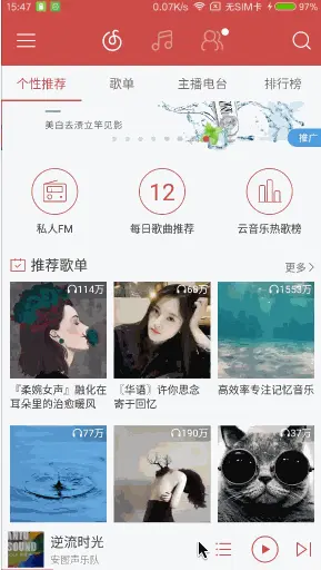 仔细分析后发现网易云音乐的Toolbar的背景其实显示的是高斯模糊图的底部,所以这里基本套路是Toolbar是透明的,后面背景图取的是高斯模糊图的底部一部分。