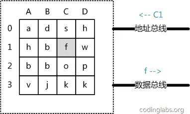 从抽象角度看,主存是一系列的存储单元组成的矩阵,每个存储单元存储固定大小的数据。每个存储单元有唯一的地址,现代主存的编址规则比较复杂,这里将其简化成一个二维地址:通过一个行地址和一个列地址可以唯一定位到一个存储单元。图5展示了一个4 x 4的主存模型。